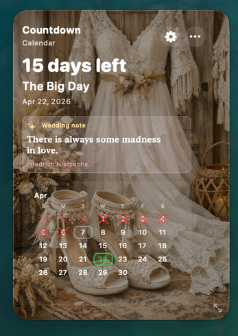 Until X helps users keep important dates, countdowns, and one active goal visible on the desktop and in widgets. It is built for people who want clarity without unnecessary complexity, accounts, or cloud syncing.